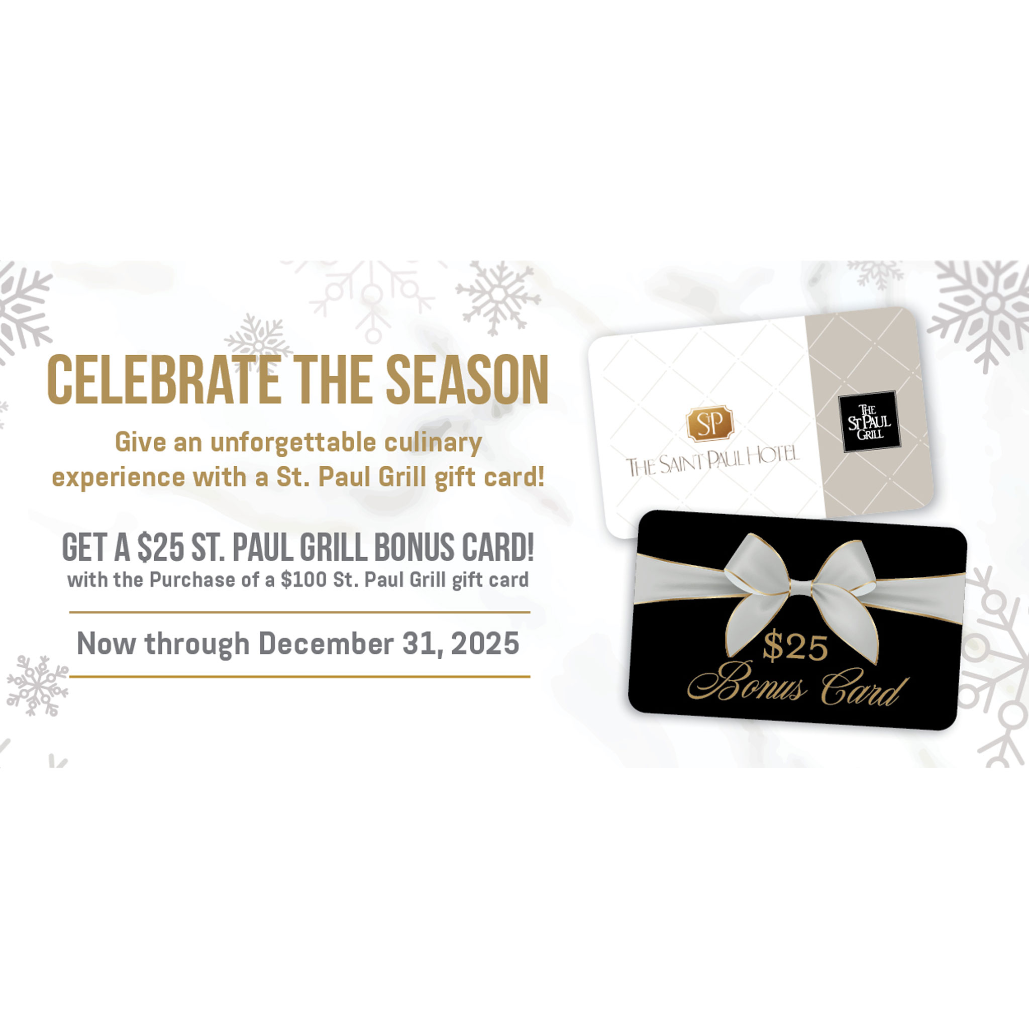 Celebrate the Season with a St. Paul Grill gift card. And the more you give, the more you get!